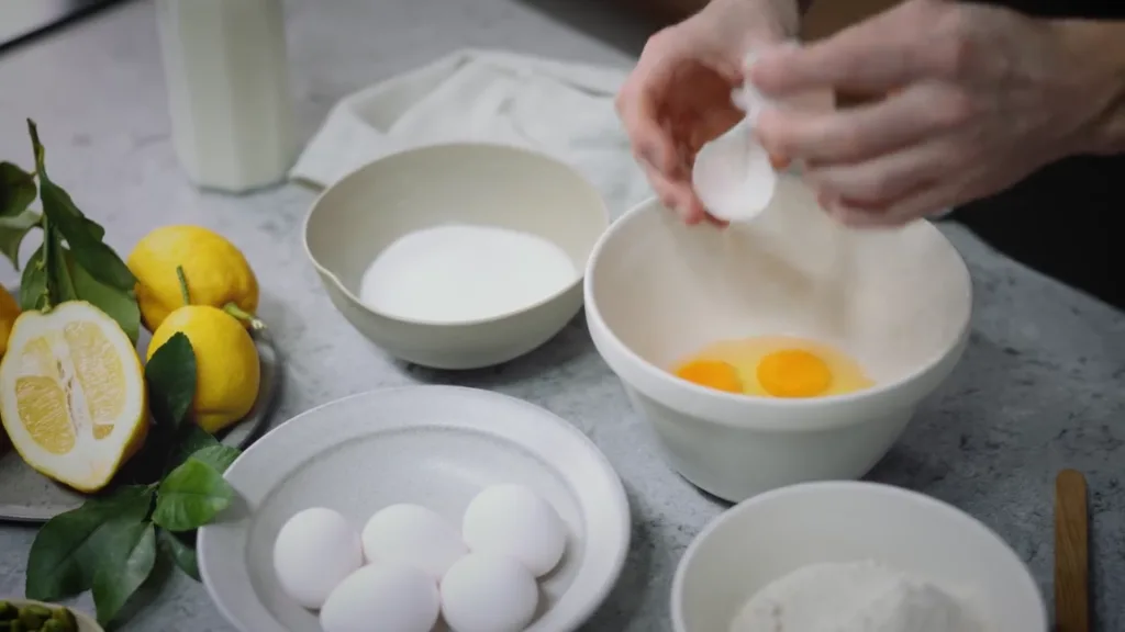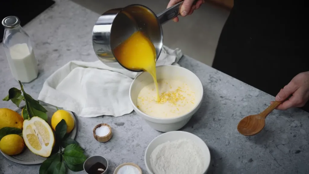 Rrihni vezët me sheqerin derisa masa të bëhet e hapur dhe kremoze. Shtoni lëkurën dhe lëngun e limonit. Në një enë tjetër, përzieni miellin, pluhurin pjekës dhe vaniljen, më pas sitini gradualisht mbi përzierjen e vezëve duke e përzier lehtë. Në fund, shtoni ngadalë përzierjen e gjalpit dhe qumështit, duke ruajtur ajrosjen e brumit.