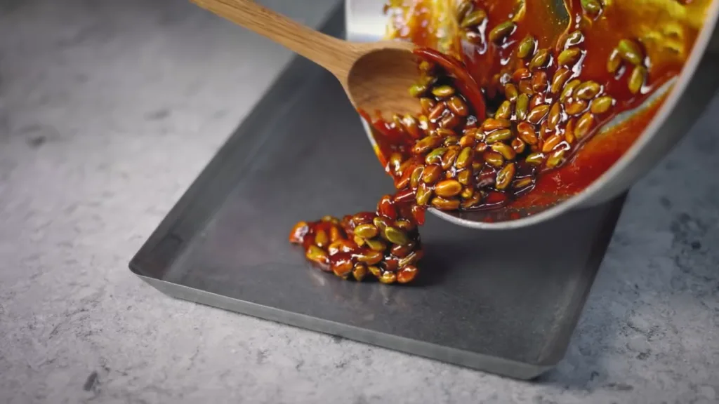 Ndërkohë që keku piqet, shkrini sheqerin në një tigan në nxehtësi mesatare derisa të marrë ngjyrë të artë. Mos e përzieni shpesh për të ruajtur karamelin të njëtrajtshëm. Shtoni fistikët dhe përziejini shpejt derisa të mbulohen plotësisht. Hidhini mbi letër pjekjeje dhe lërini të ftohen. Pasi të forcohen, copëtojini trashë.